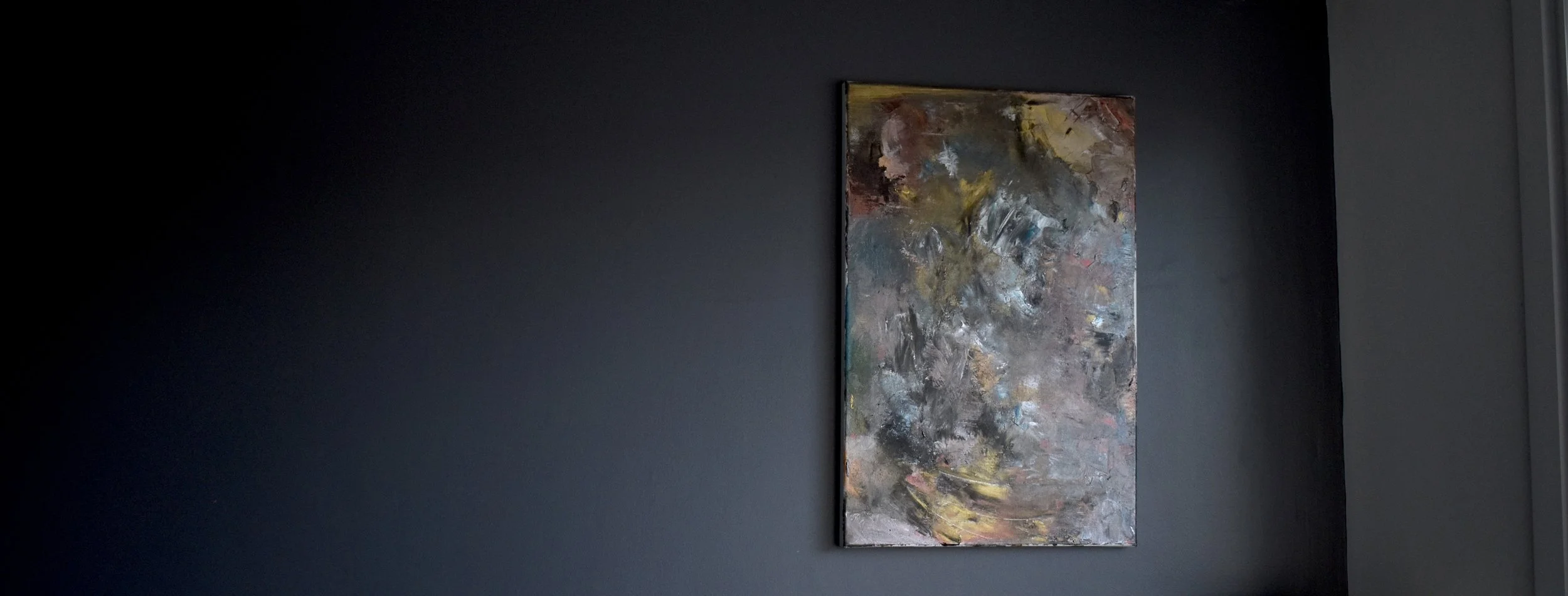 La surface se construit par strates, alternant zones fluides et textures plus denses. Des tonalités sombres et minérales dominent — gris, noirs profonds, bruns — ponctuées de nuances plus diffuses, parfois iridescentes. Selon l’angle de lumière, certaines zones se révèlent, d’autres s’effacent, renforçant l’impression d’un tableau en perpétuelle transformation.